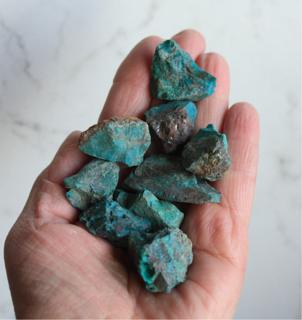 Chrysocolla is een steen die voor zelfvertrouwen staat en een ontgiftende werking heeft. De steen helpt bij het luisteren naar jezelf en werkt verkoelend en ontspannend.