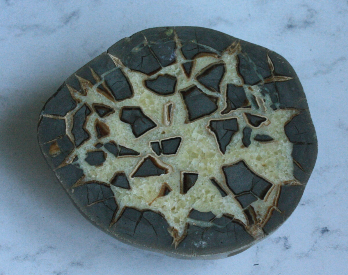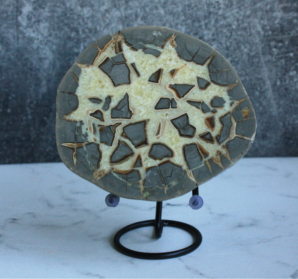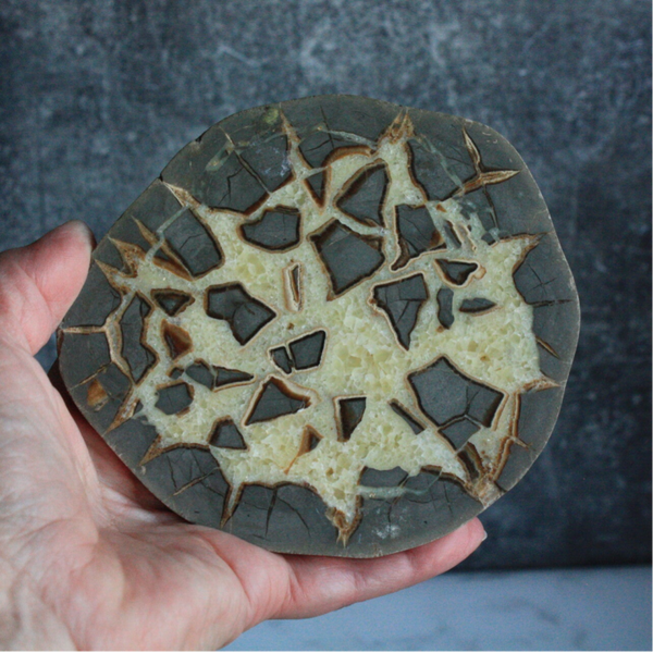 Werking: Septarie heeft een aardende, zuiverende en kalmerende werking. De steen bevordert zelfgenezing, eigenwaarde en tolerantie. Septarie heeft een sterke connectie met de aarde en natuur.