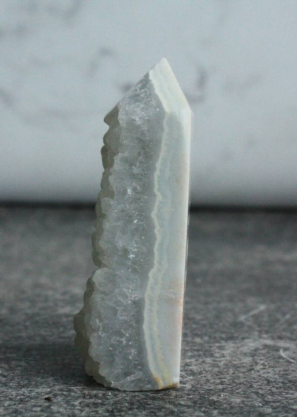 Witte agaat toren met druzy, half gepolijst uit Brazilië