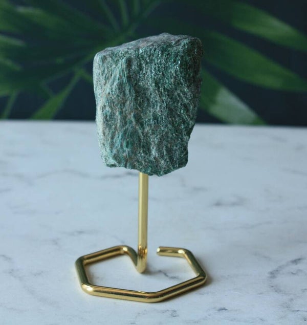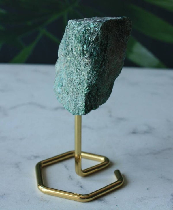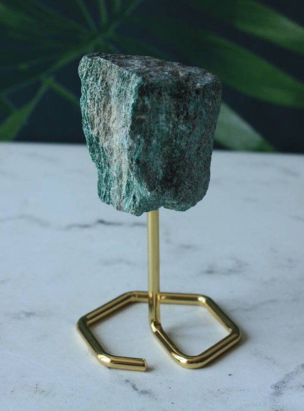 Ruwe fuchsiet op goudkleurige standaard uit Brazilië.