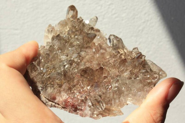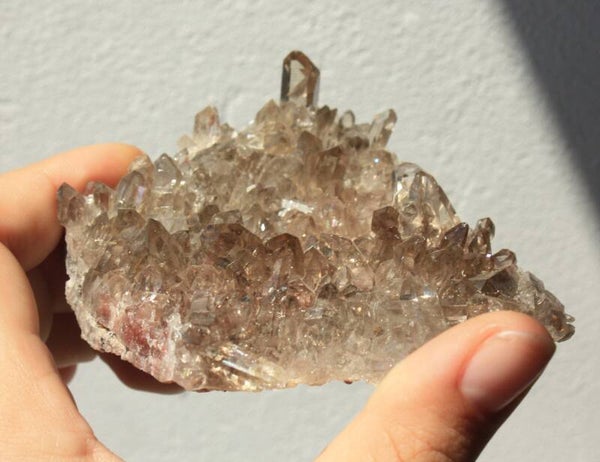 Rookkwarts cluster met roze lithium en gouden rutiel uit Brazilië.
