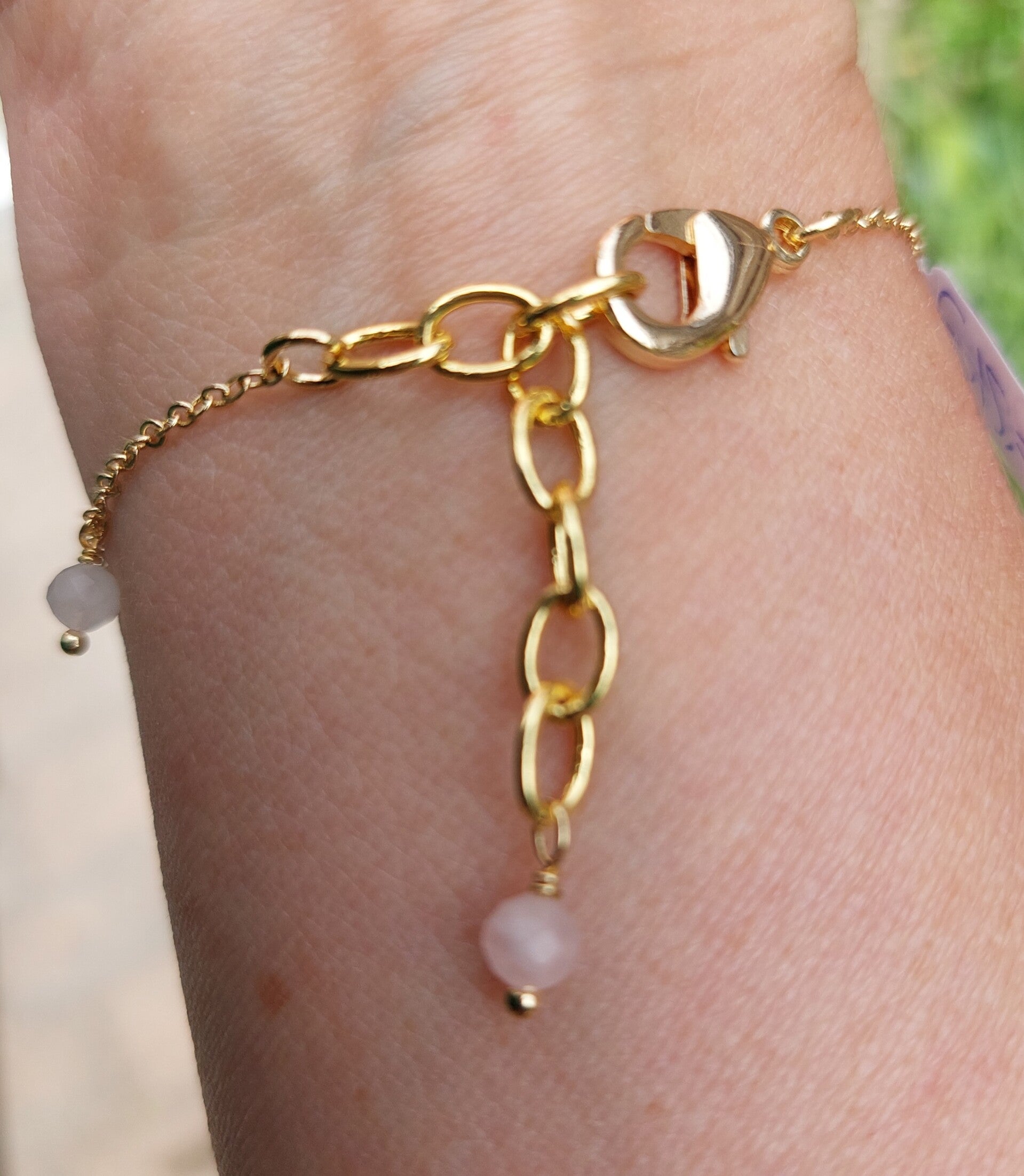 Het armbandje is gemaakt van messing, een legering van koper en zink. dit is verguld met 18 karaat goud.