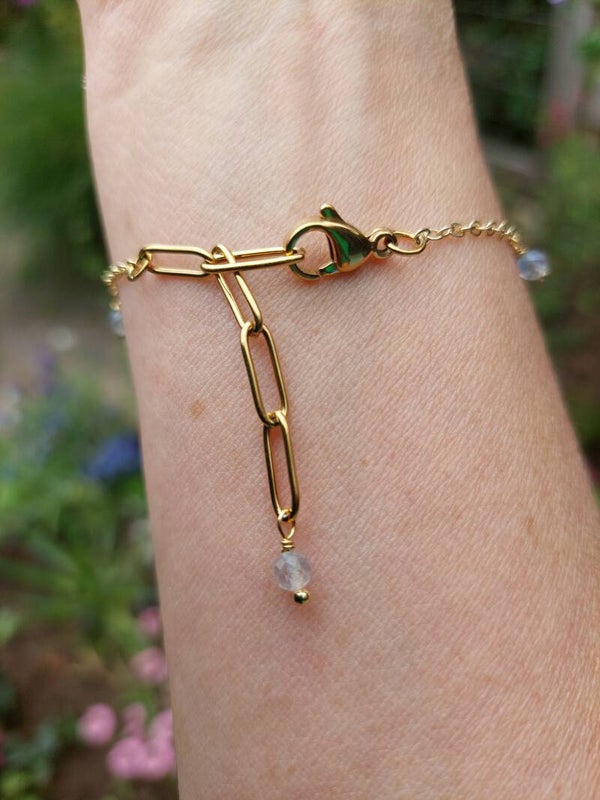 Het armbandje is gemaakt van messing, een legering van koper en zink. dit is verguld met 18 karaat goud.