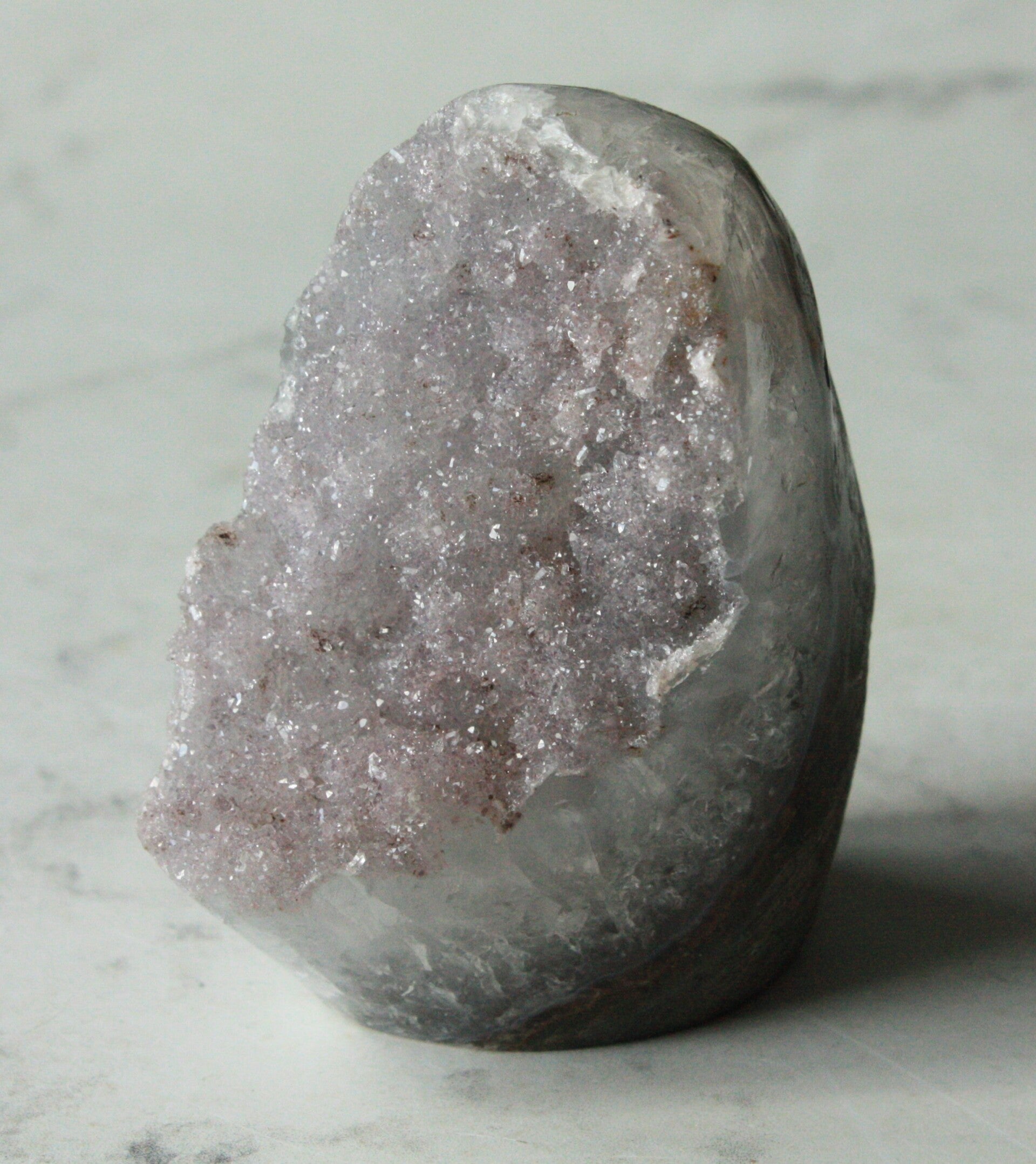 Amethist cutbase met (pastel paarse) druzy uit Brazilië.