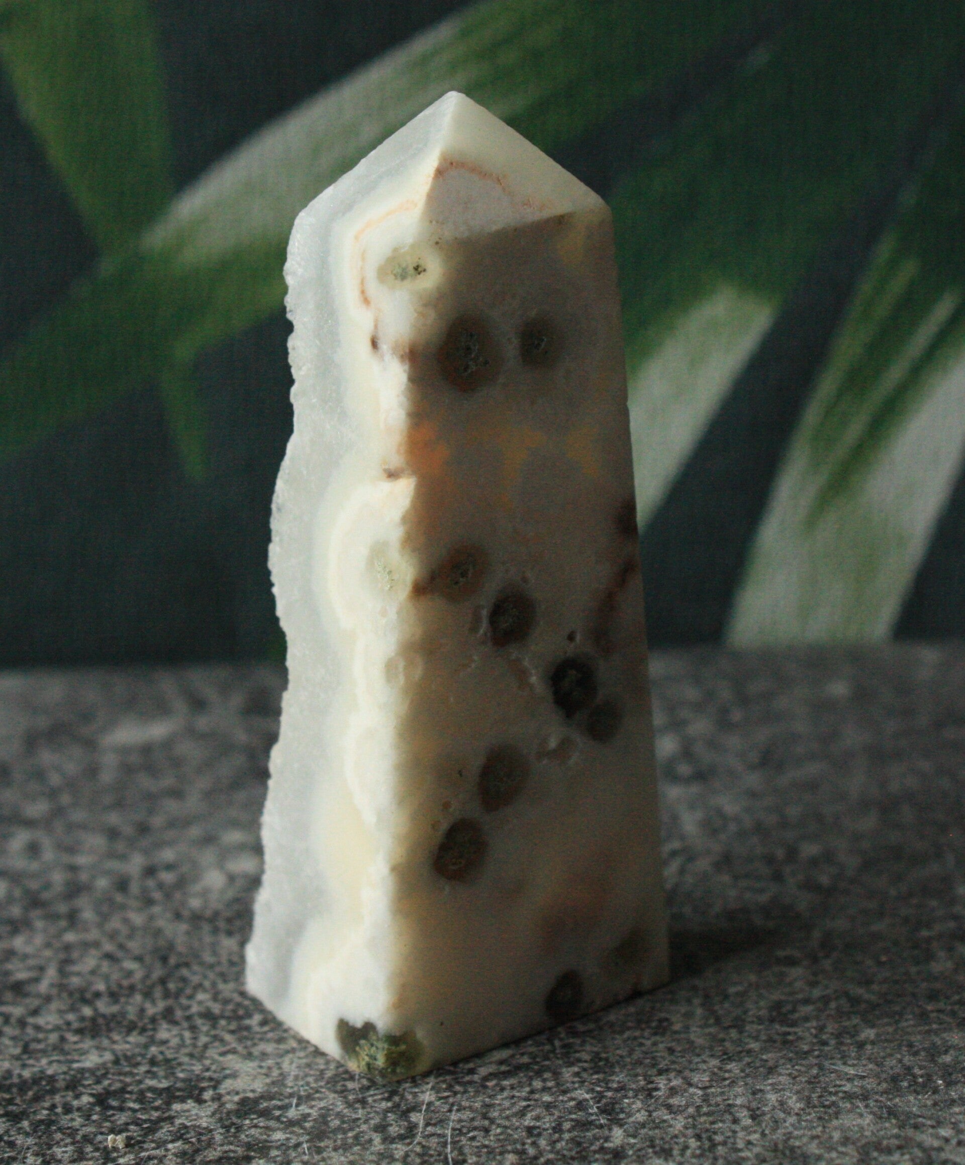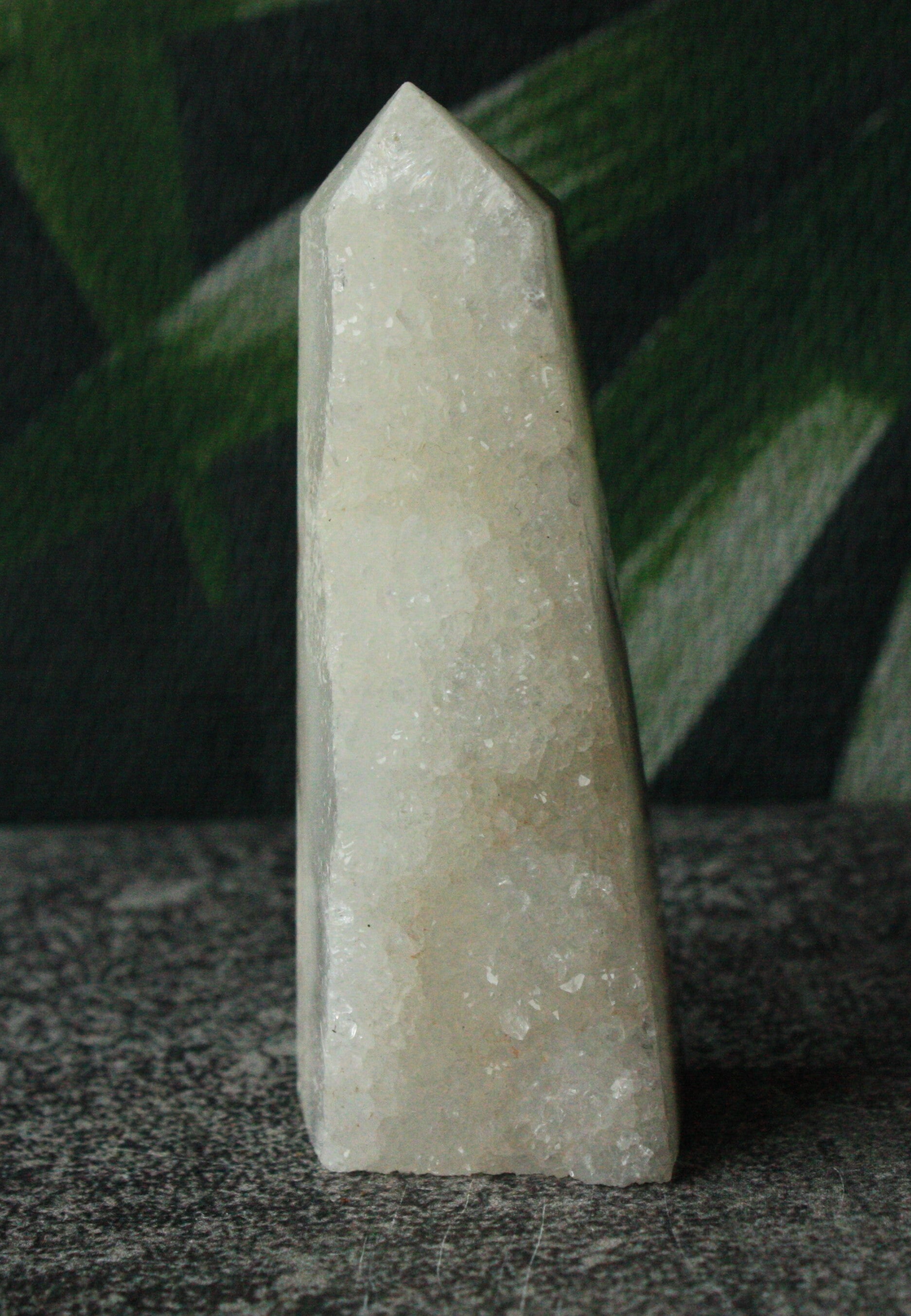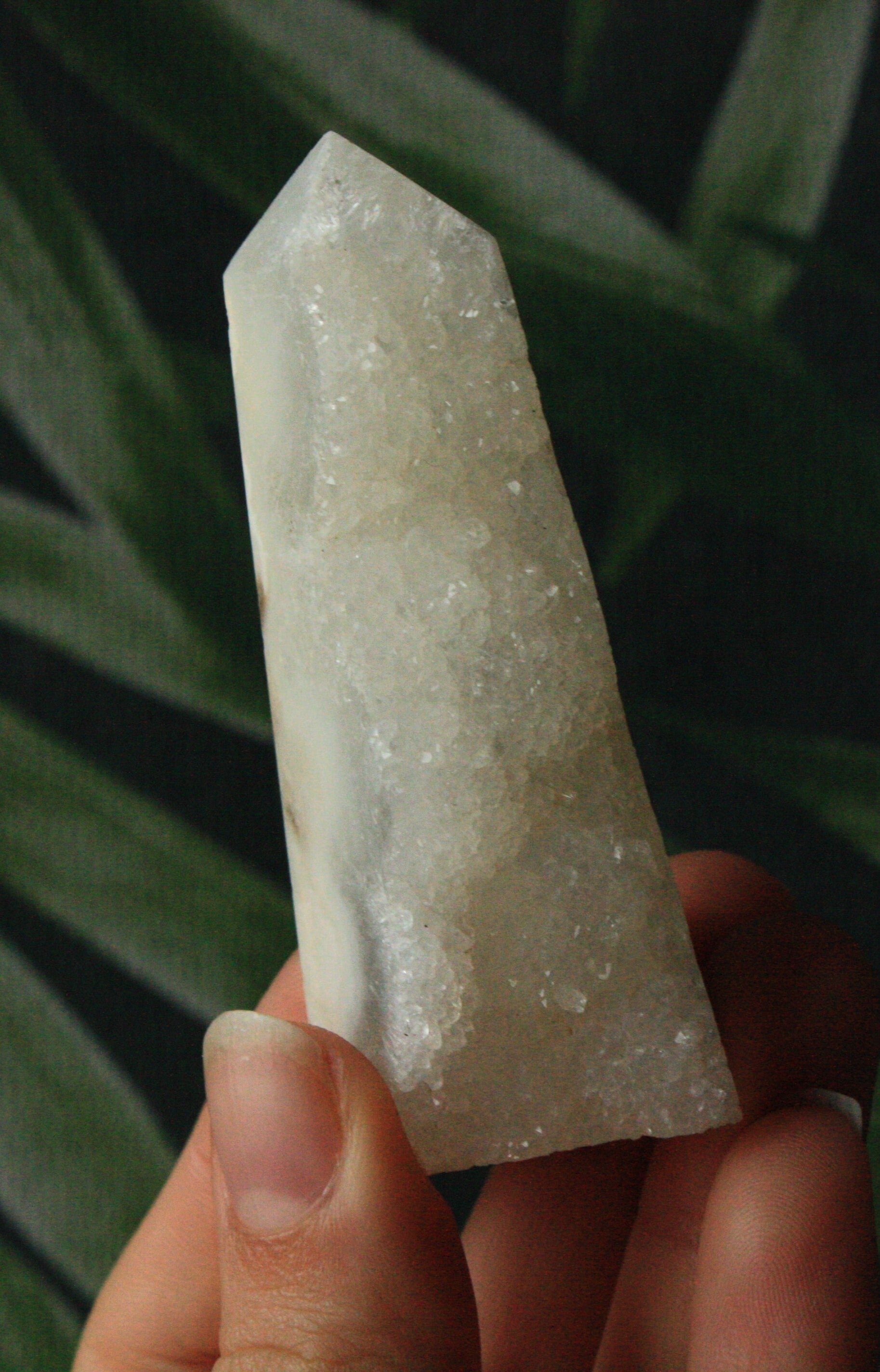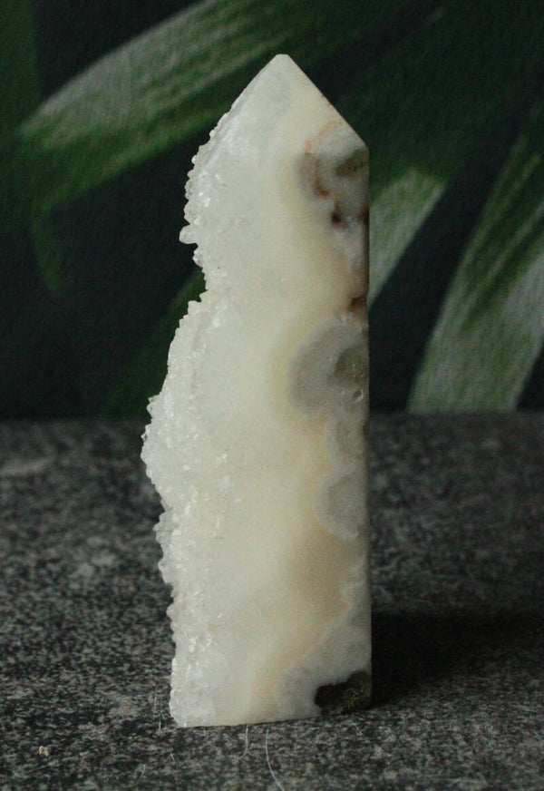 Witte agaat toren met druzy, half gepolijst uit Brazilië
