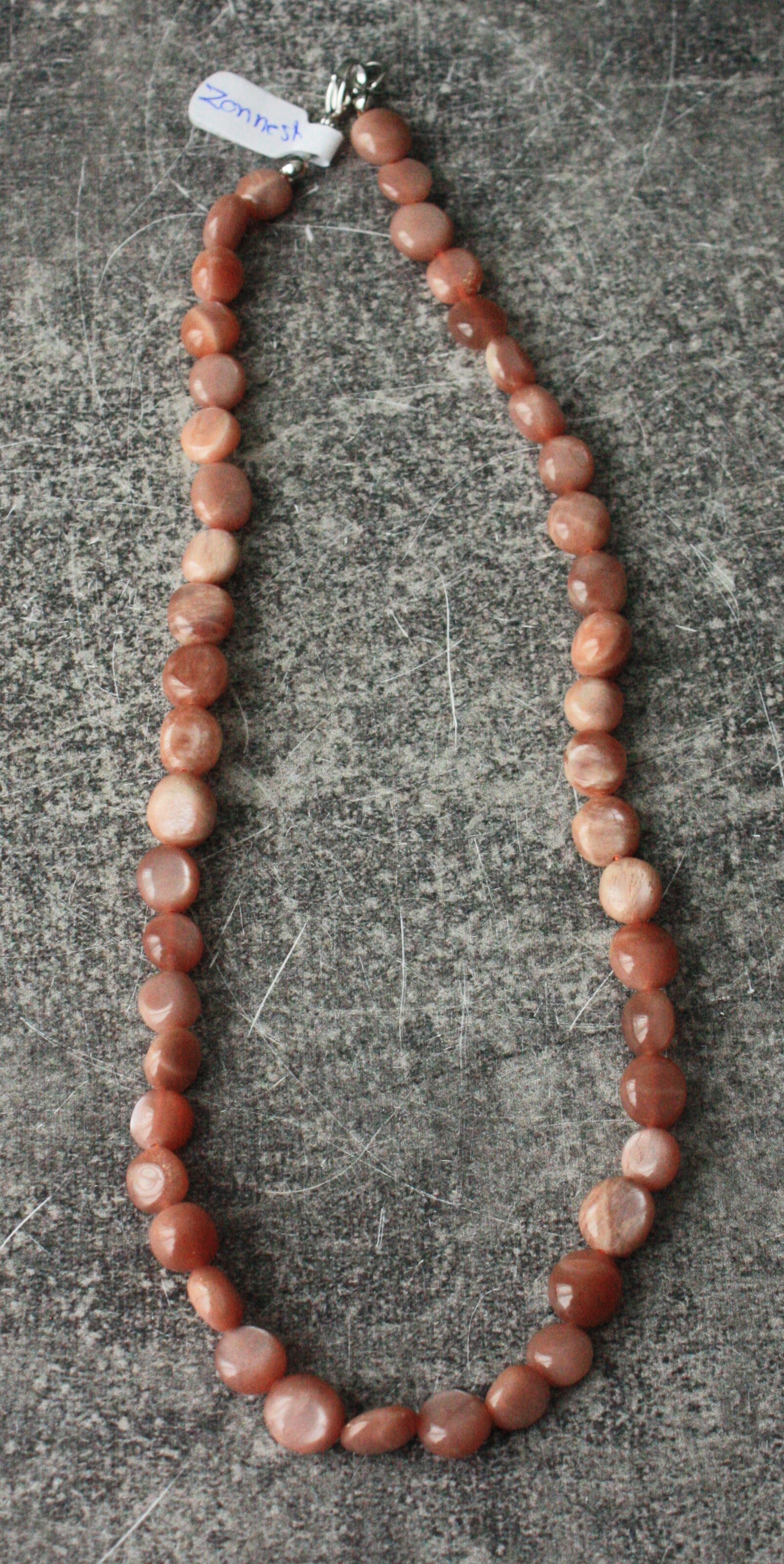 Zonnesteen kralen ketting met zilverkleurige sluiting.