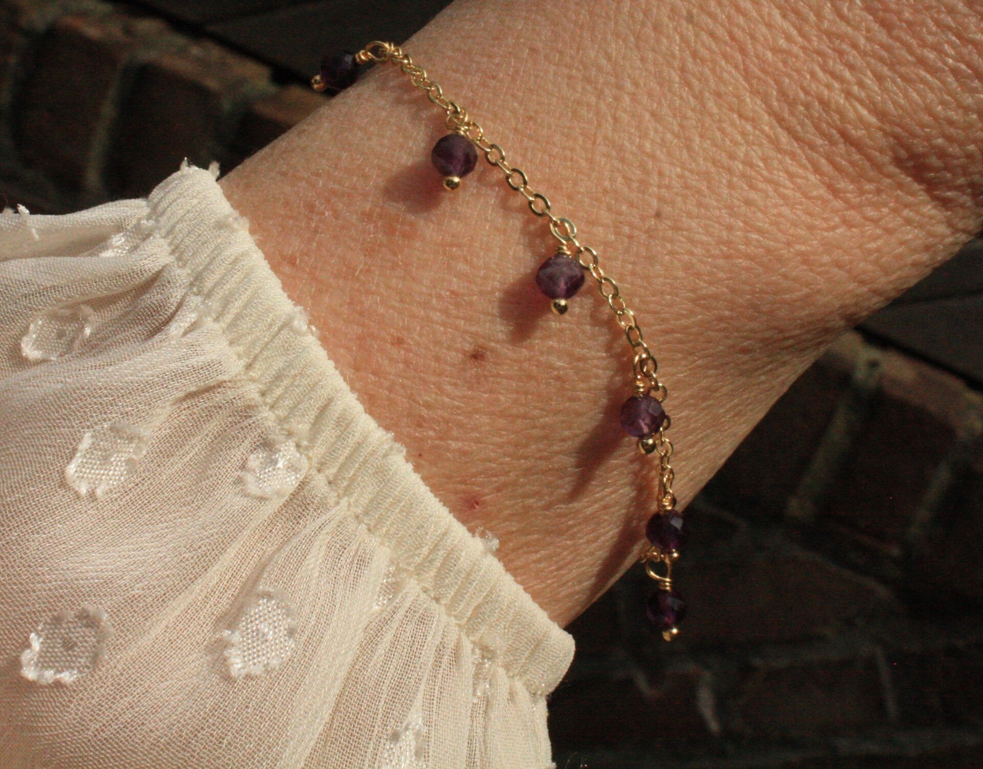 Amethist armbandje (met loshangende kraaltjes, goudkleurig)