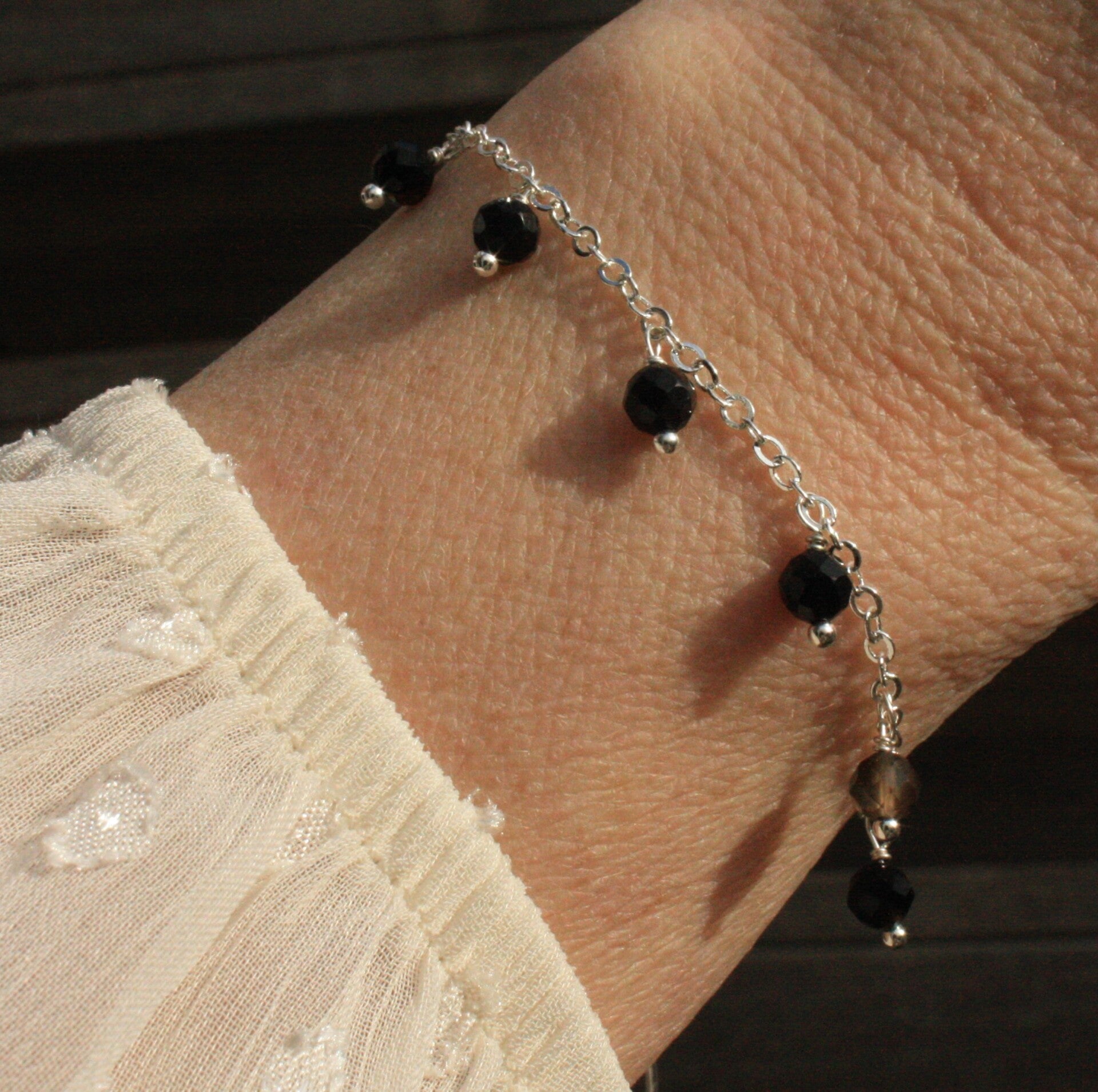 Onyx armbandje (met los hangende kraaltjes, zilverkleurig)